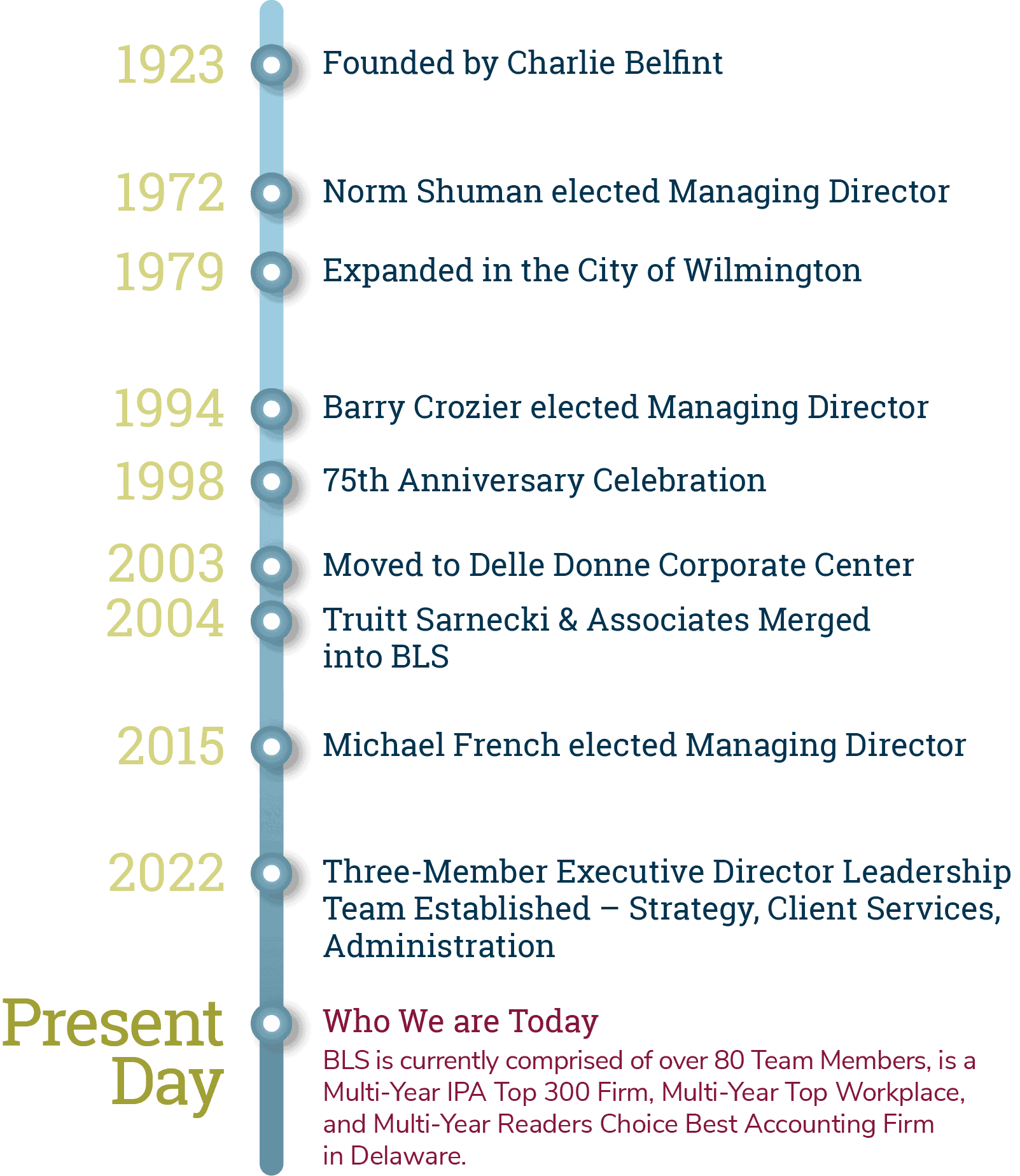 BLS was founded in 1923 as a small accounting practice whose staff was committed to building long-standing, mutually beneficial relationships with clients and business associates. Today, with more than 80 professionals, we have become one of the largest and most respected certified public accounting firms in Delaware while never losing sight of our founding commitments. We have a diverse client base and offer services such as: advisory services, assurance, auditing, tax planning and compliance, small business services, litigation support, employee benefit plan audits, succession planning, business and management consulting, and corporate services for investment holding companies.